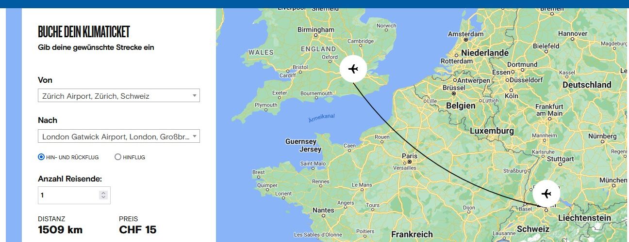 CO2 Ausstoss deines Fluges berechnen und mit dem Klimarechner des Klimatickets.ch den CO2 Ausstoss komensieren. Es wird mit deinem Geld eine Solaranlage in der Schweiz gebaut und aus dem Erlös finanziert der zertifizierte Verein wiederum Solaranlgen in Afrika. https://klimaticket.ch/